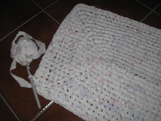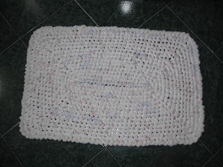 Desta vez fiz um tapete em tecido reciclado, o tecido e de uns lençóis já velhos de flanela.